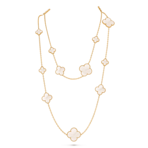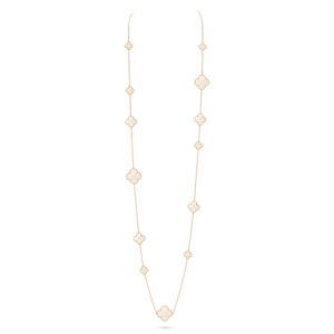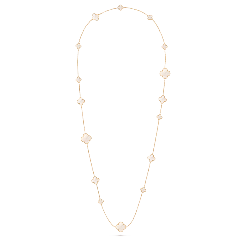 The Magic Alhambra long necklace features sixteen signature four-leaf clover motifs crafted from natural materials and framed with delicate 18K gold beaded edges. This piece symbolizes luck, elegance, and timeless craftsmanship.