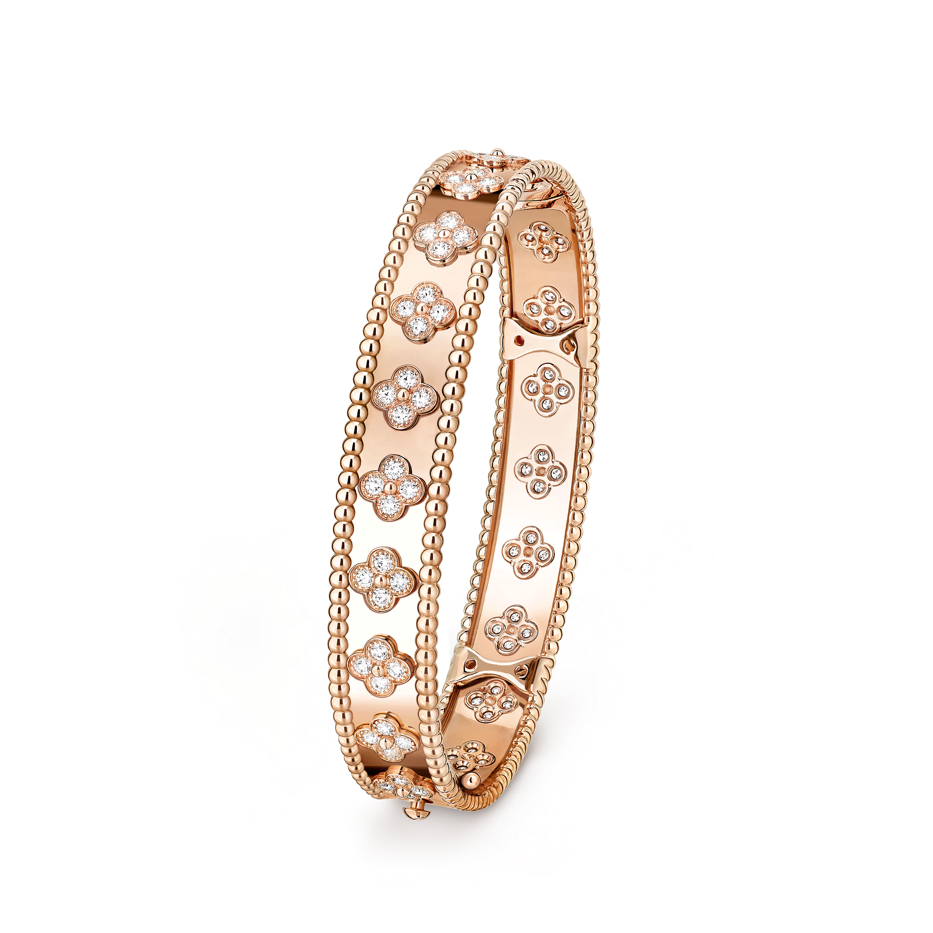 Each clover is meticulously rendered to reveal smooth, balanced petals framed by a halo of polished gold beads. The rounded contours add depth and brilliance, enhancing the motif’s gentle symmetry and imbuing the bracelet with a playful radiance.