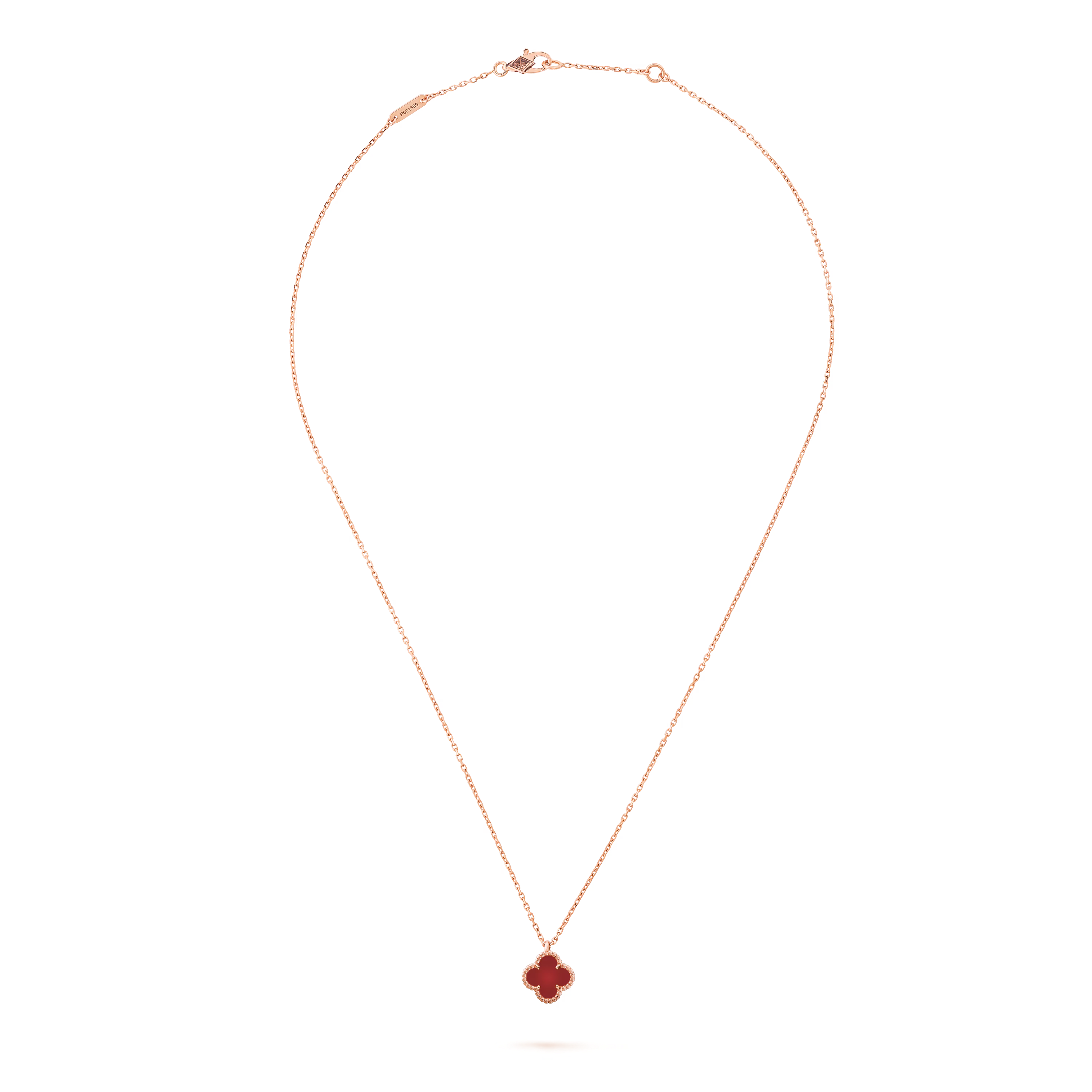 Delicate, joyful, and full of symbolic charm, the Sweet Alhambra Pendant Mini embodies the essence of Van Cleef & Arpels’ timeless clover design. Crafted in warm 18K rose gold, this pendant features a vibrant carnelian stone at its center, capturing the Maison’s poetic celebration of luck, beauty, and craftsmanship.