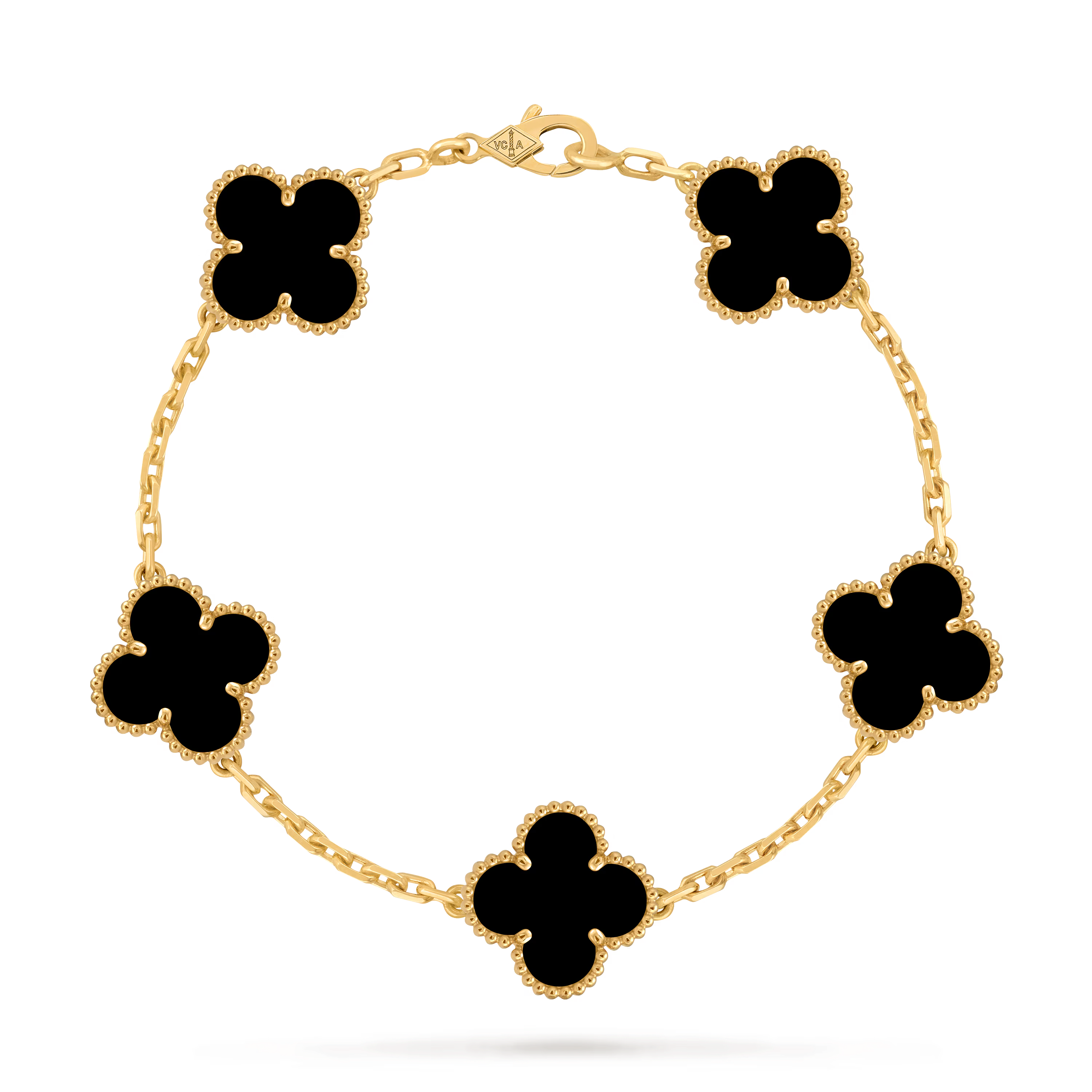 This bracelet features five Vintage Alhambra motifs, evenly spaced along the chain. The symmetrical arrangement creates a refined rhythm and balanced silhouette on the wrist, reflecting classic proportions and understated sophistication.