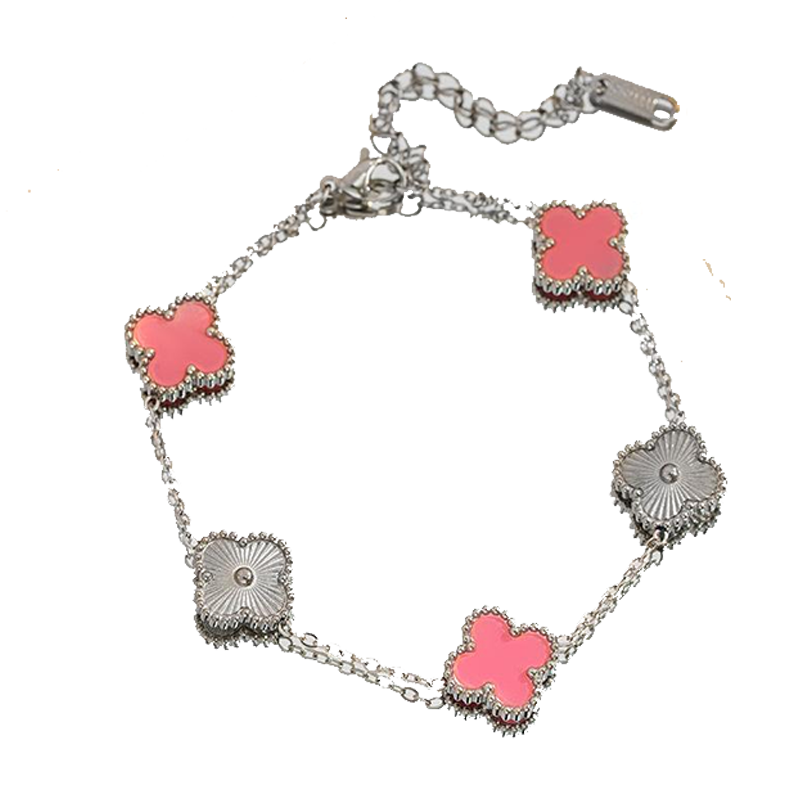 Each motif is adorned with rose rhodonite, admired for its soft pink tones and natural marbling. The gemstone’s gentle warmth brings a delicate femininity to the design, while subtle variations in color ensure that every bracelet is uniquely beautiful.