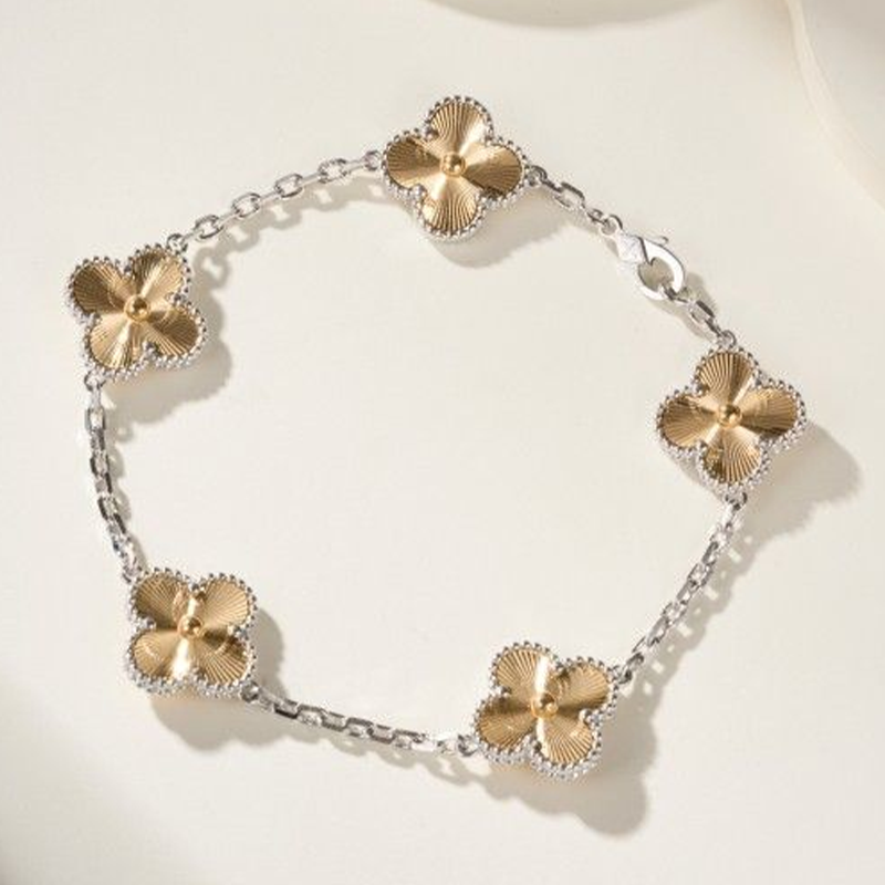 Each four-leaf clover motif is framed by the collection’s iconic beaded edge. This distinctive detail adds depth, texture, and a sculptural dimension, enhancing the bracelet’s instantly recognizable character.