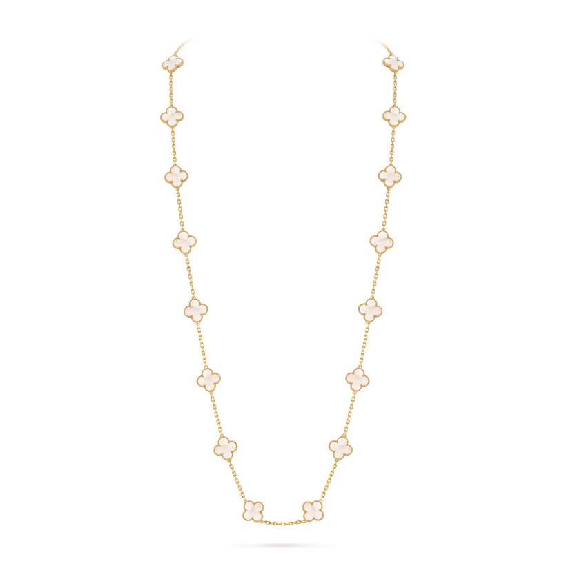 The Vintage Alhambra long necklace showcases twenty iconic clover motifs symbolizing luck and timeless elegance. Each motif is crafted from natural materials and framed by delicate beaded 18K gold edges, creating a harmonious and recognizable silhouette.