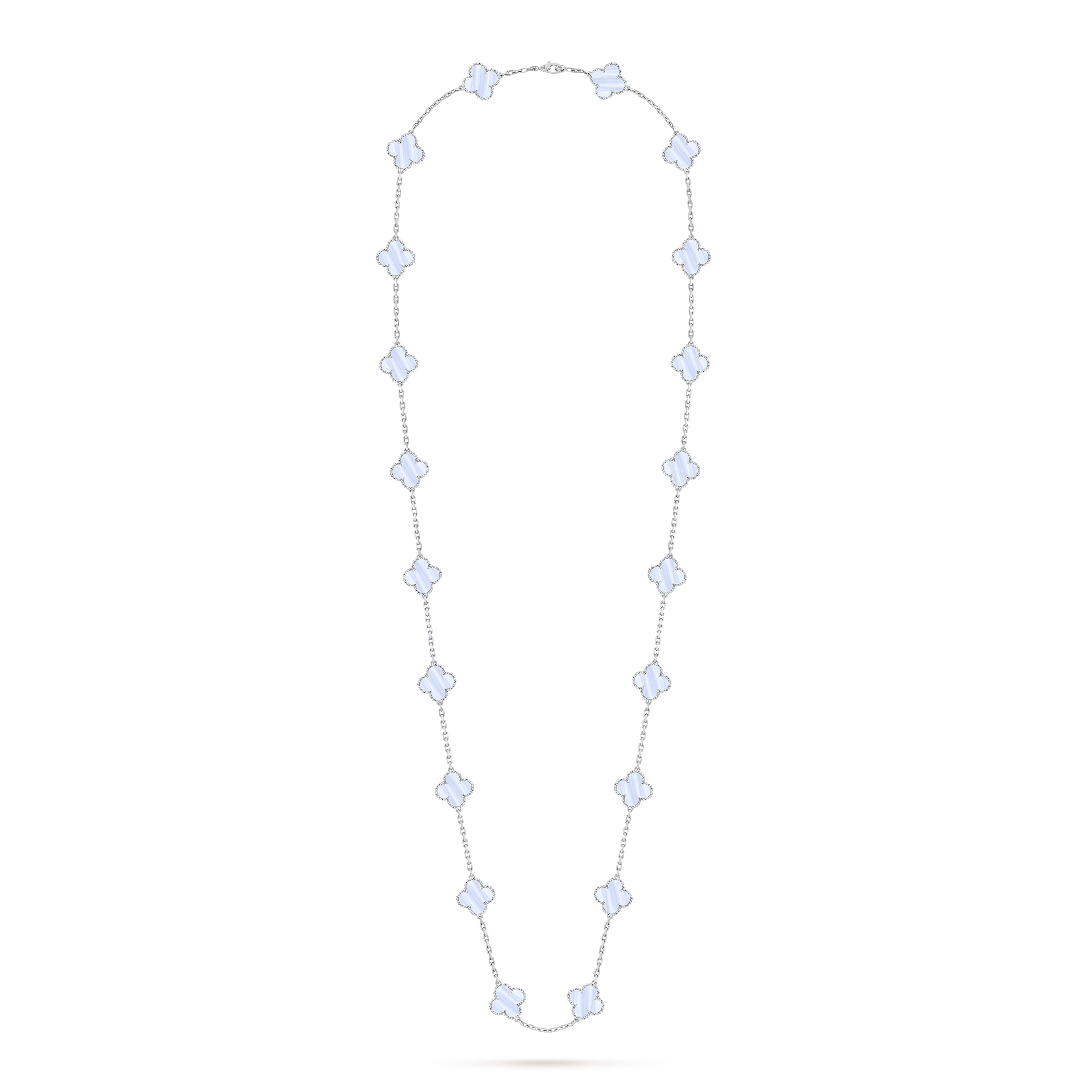 A luminous interpretation of an icon, the Vintage Alhambra Long Necklace in 18K white gold and chalcedony embodies the Maison’s enduring celebration of luck, harmony, and timeless beauty. With twenty radiant motifs arranged in a graceful sautoir length, this creation offers an effortless blend of sophistication and softness.