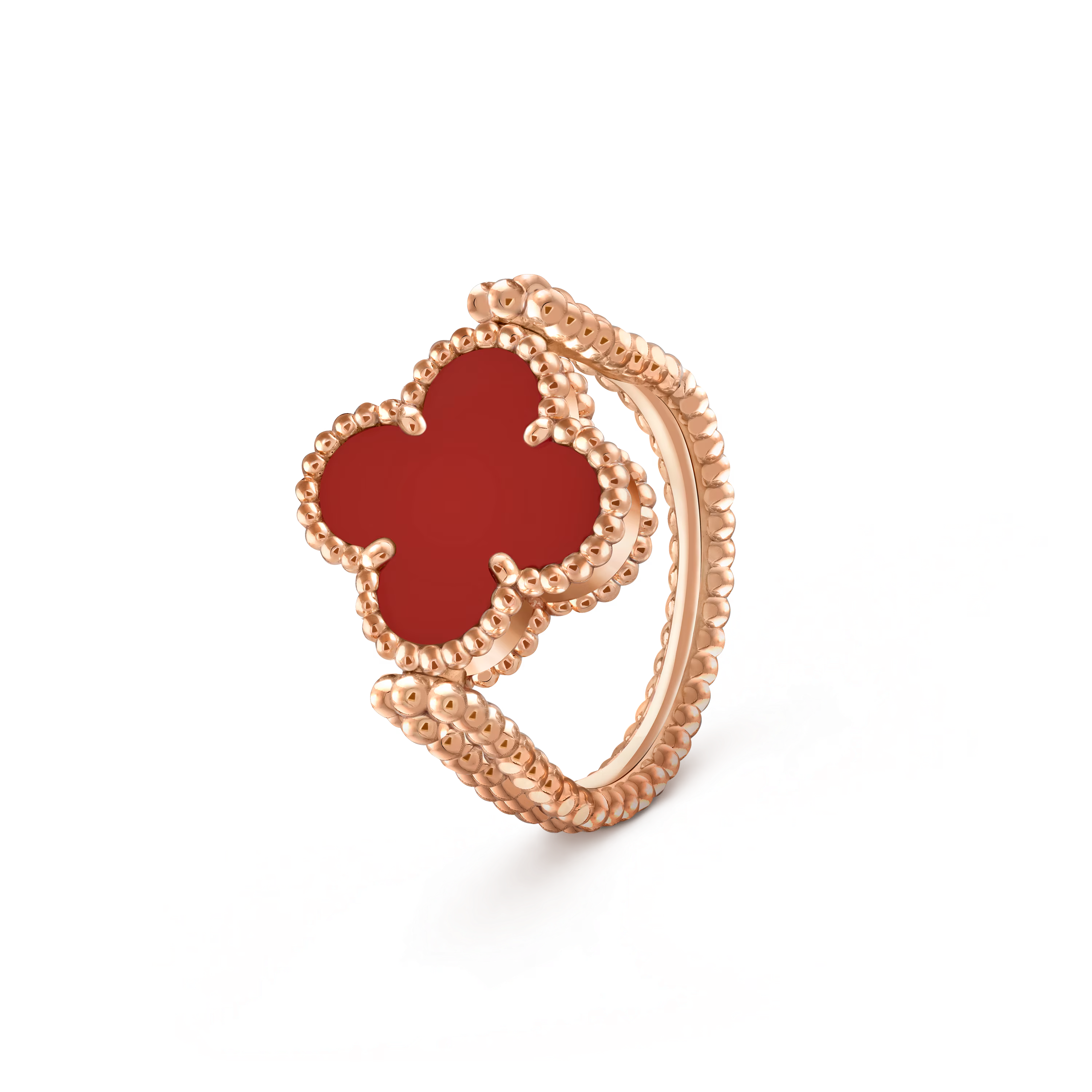 A captivating expression of versatility and grace, the Vintage Alhambra Reversible Ring reimagines the Maison’s iconic emblem of luck through an innovative, two-sided design. Crafted in glowing 18K rose gold, this ring lets you choose between two distinct moods—each infused with the timeless poetry of the Alhambra Collection.
