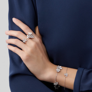 The Frivole collection celebrates the brilliance of nature with finely sculpted flowers that seem to come alive with light. This 5-flower bracelet transforms the wrist into a garden of luminous reflections, embodying freshness, elegance, and effortless charm.