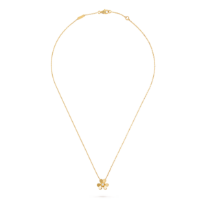 At the heart of the motif lies a single sparkling diamond, carefully selected for its clarity and radiance. Its brilliant-cut facets illuminate the polished gold petals, enhancing the pendant’s refined elegance.
