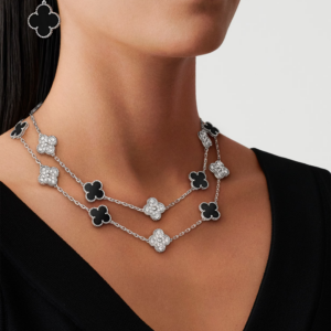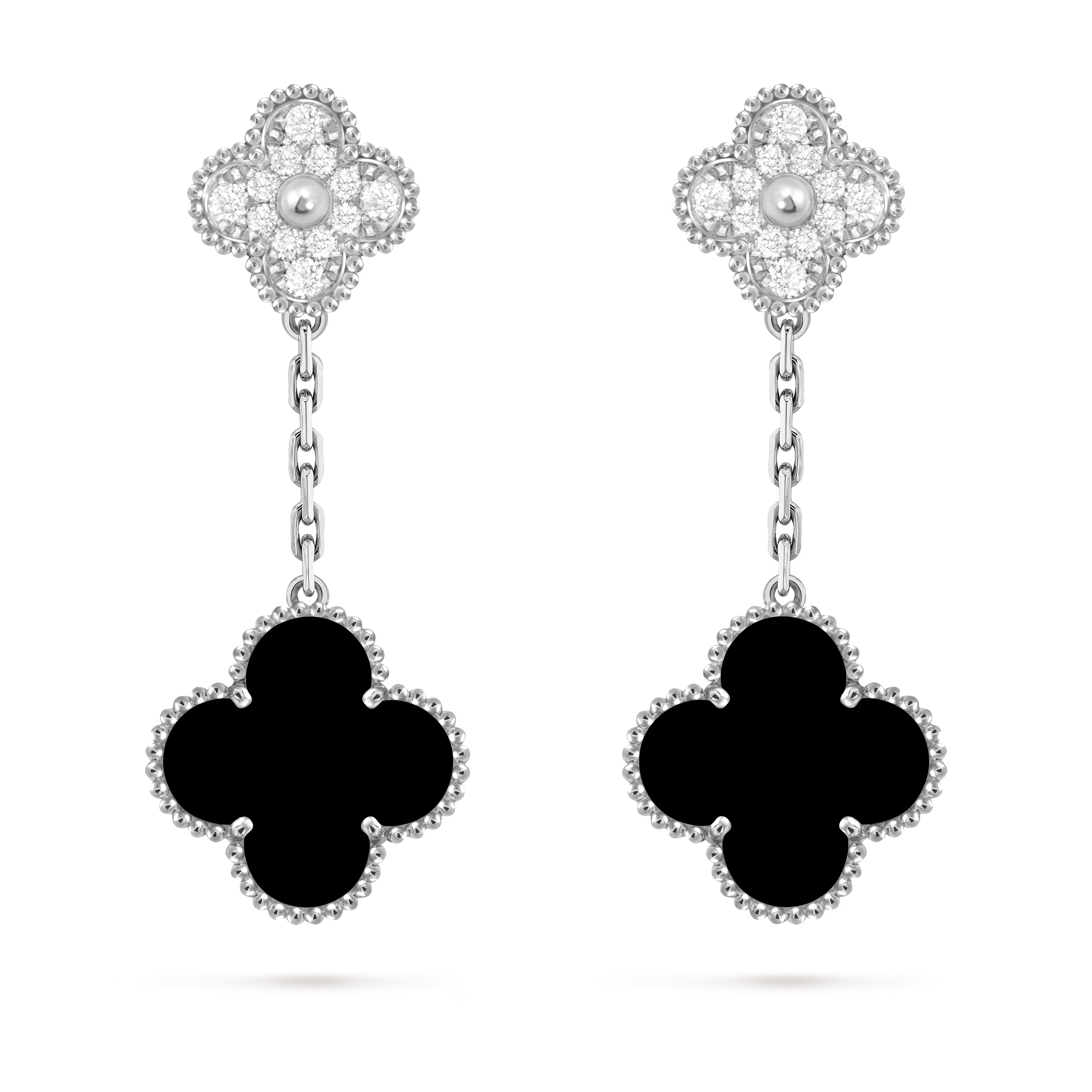 Inspired by the poetic beauty of luck, the Magic Alhambra earrings reinterpret the Maison’s emblematic four-leaf clover through an elegant interplay of shapes and proportions. This two-motif design pairs one larger motif with a smaller counterpart, creating a gentle rhythm and a natural sense of movement that illuminates the face with every turn.