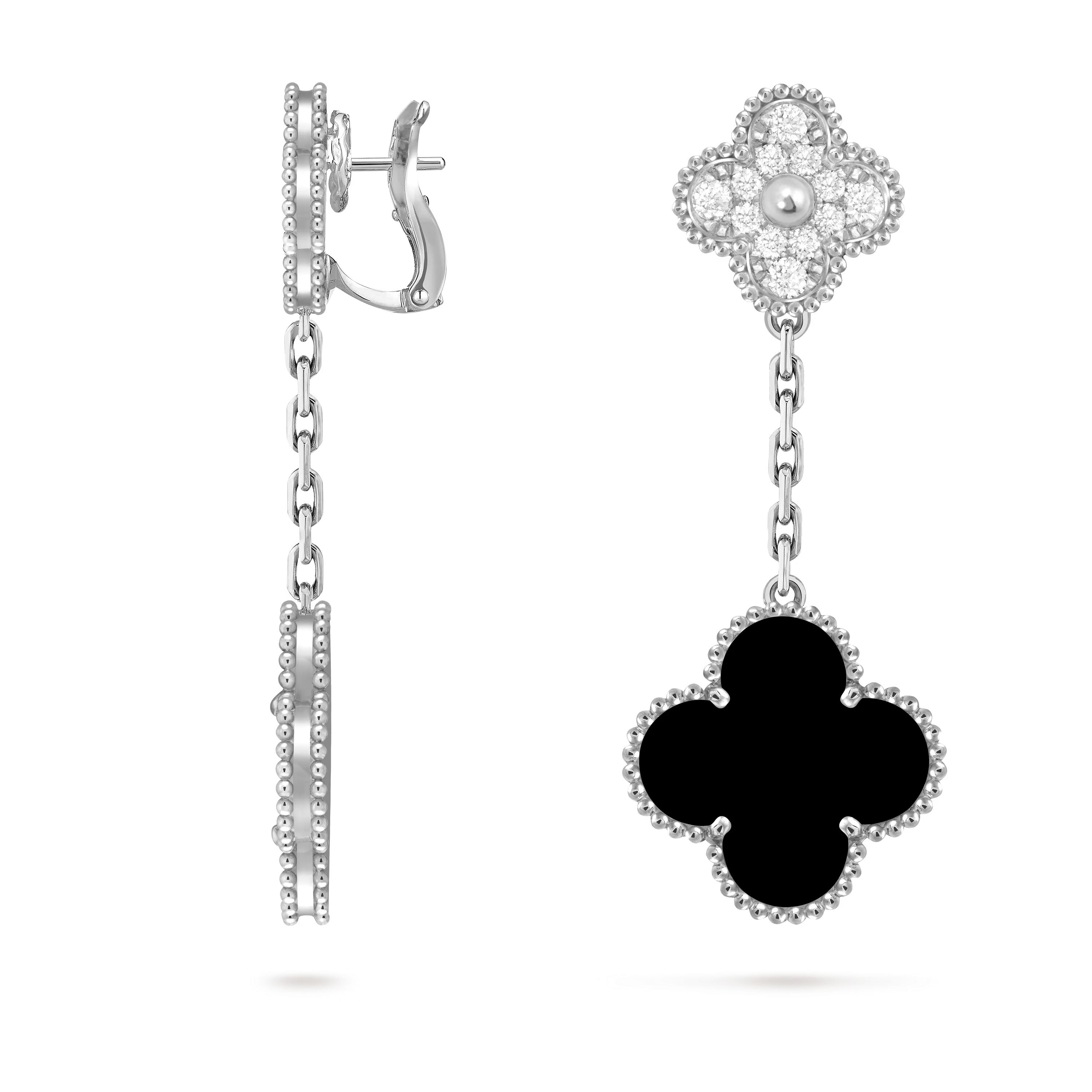 Crafted in radiant 18K gold, each motif is framed by the signature hand-polished beaded contour, a hallmark of Van Cleef & Arpels’ exceptional craftsmanship. The motifs are set with carefully selected natural stones — prized for their depth, iridescence, and unique character — enhancing the earrings’ refined harmony and timeless charm.