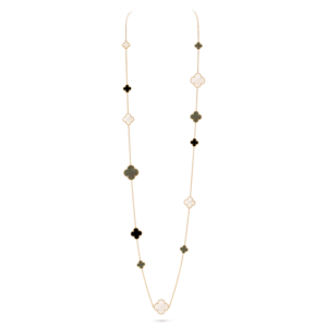 The Magic Alhambra long necklace features sixteen signature four-leaf clover motifs crafted from natural materials with delicate 18K gold beaded edges. The design embodies luck, elegance, and the Maison’s timeless craftsmanship, combining classic charm with a playful, contemporary spirit.