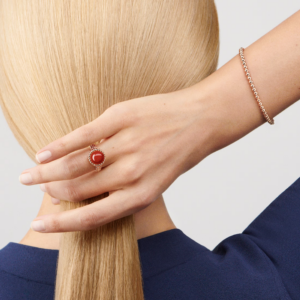 The 18K rose gold with carnelian version offers a warm, passionate glow. Carnelian’s vibrant red-orange hue radiates energy and optimism, beautifully contrasted by the soft, feminine blush of rose gold. The surrounding golden pearls add dimension and light, framing the stone with exceptional craftsmanship.
