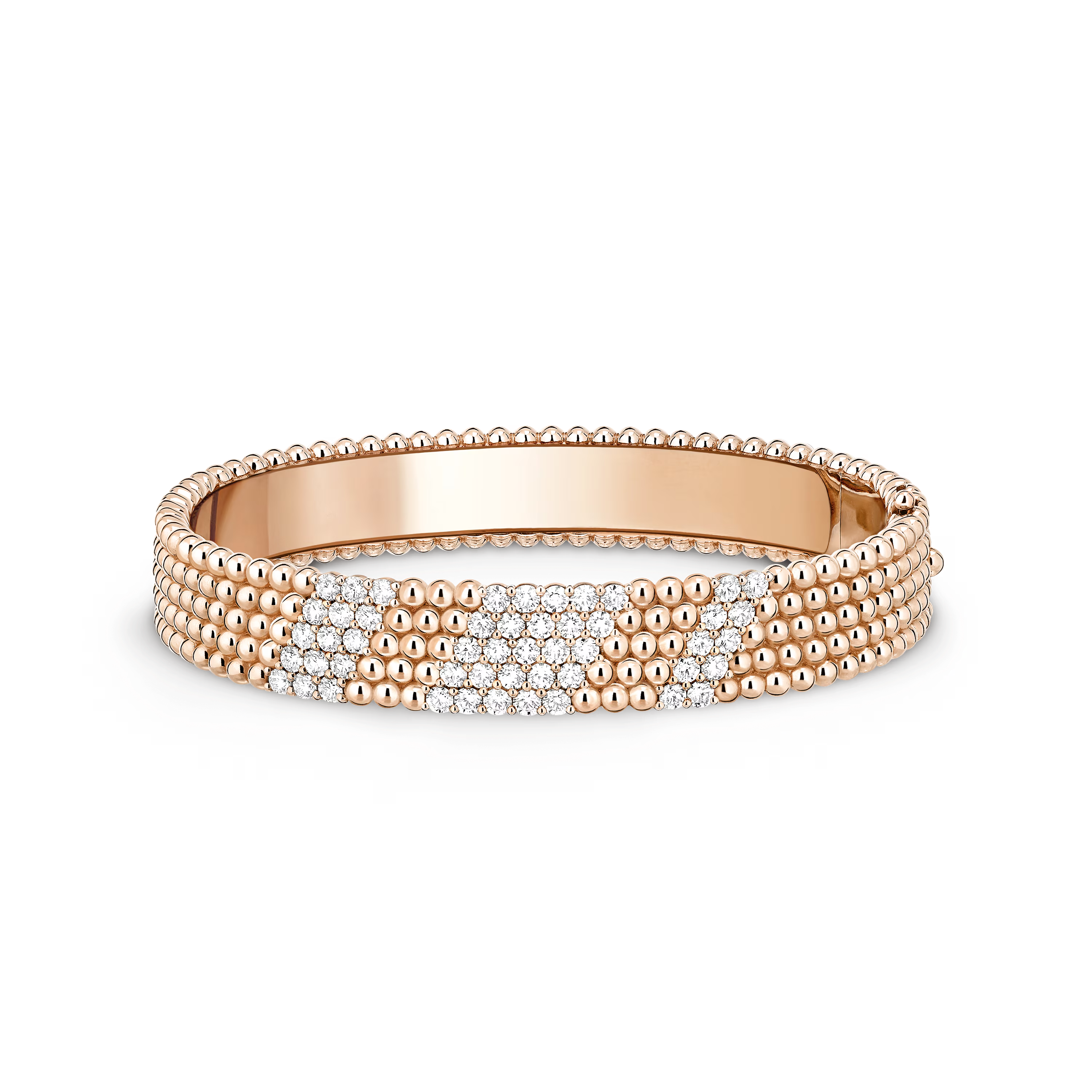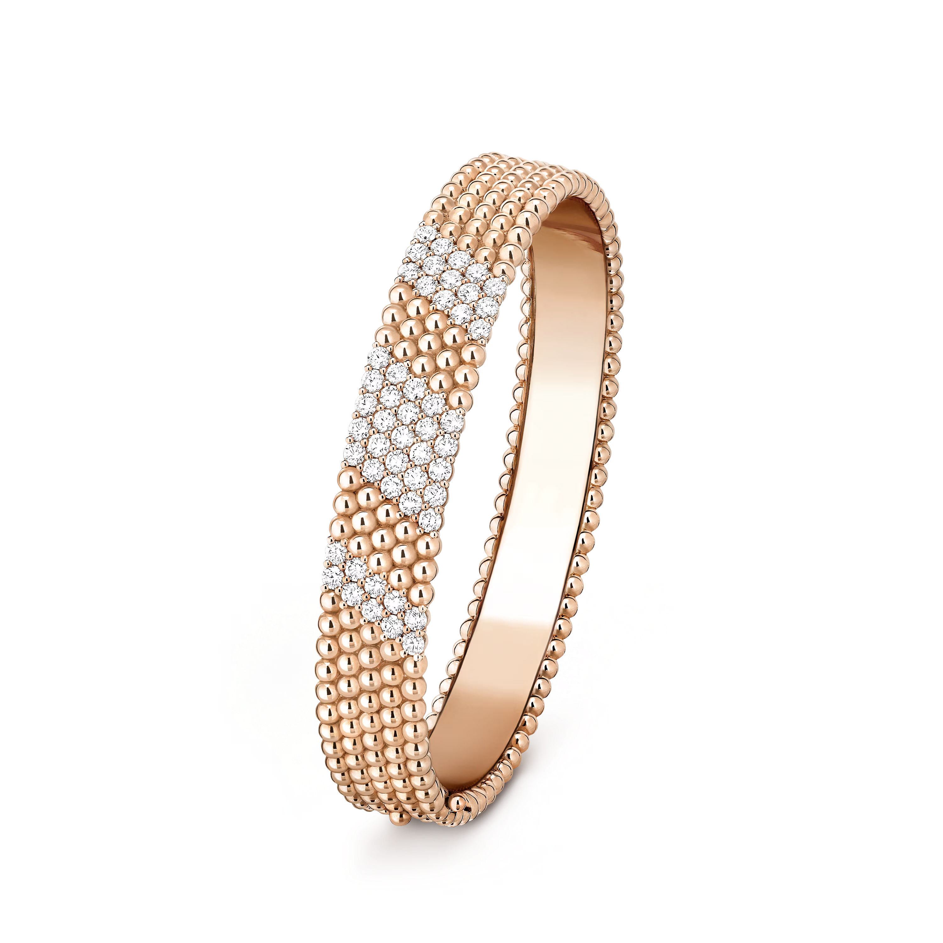 The design features five meticulously aligned rows of rounded beads—each shaped, polished, and finished by the Maison’s expert artisans. Their mirror-like shine creates a captivating surface that radiates warmth and elegance with every movement.