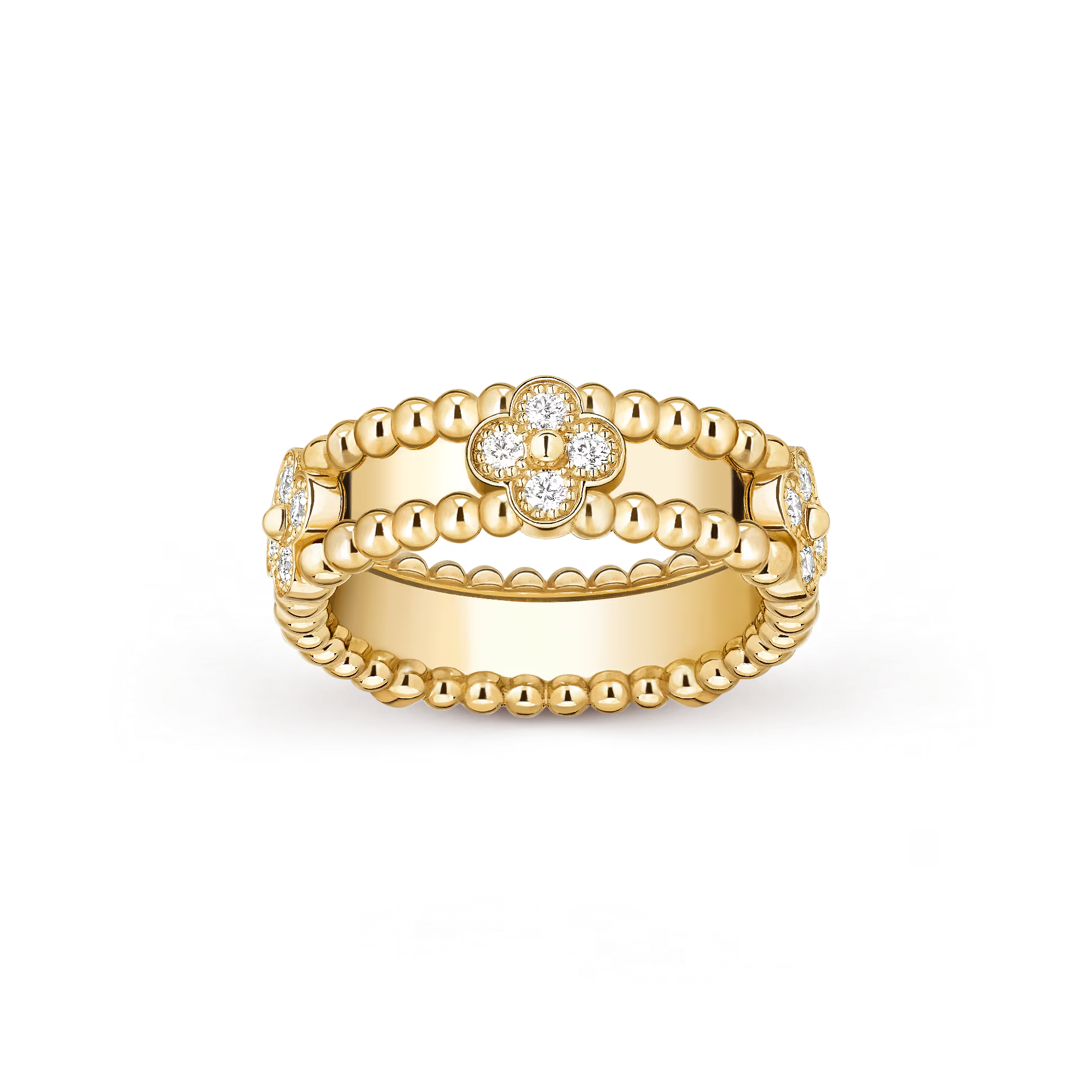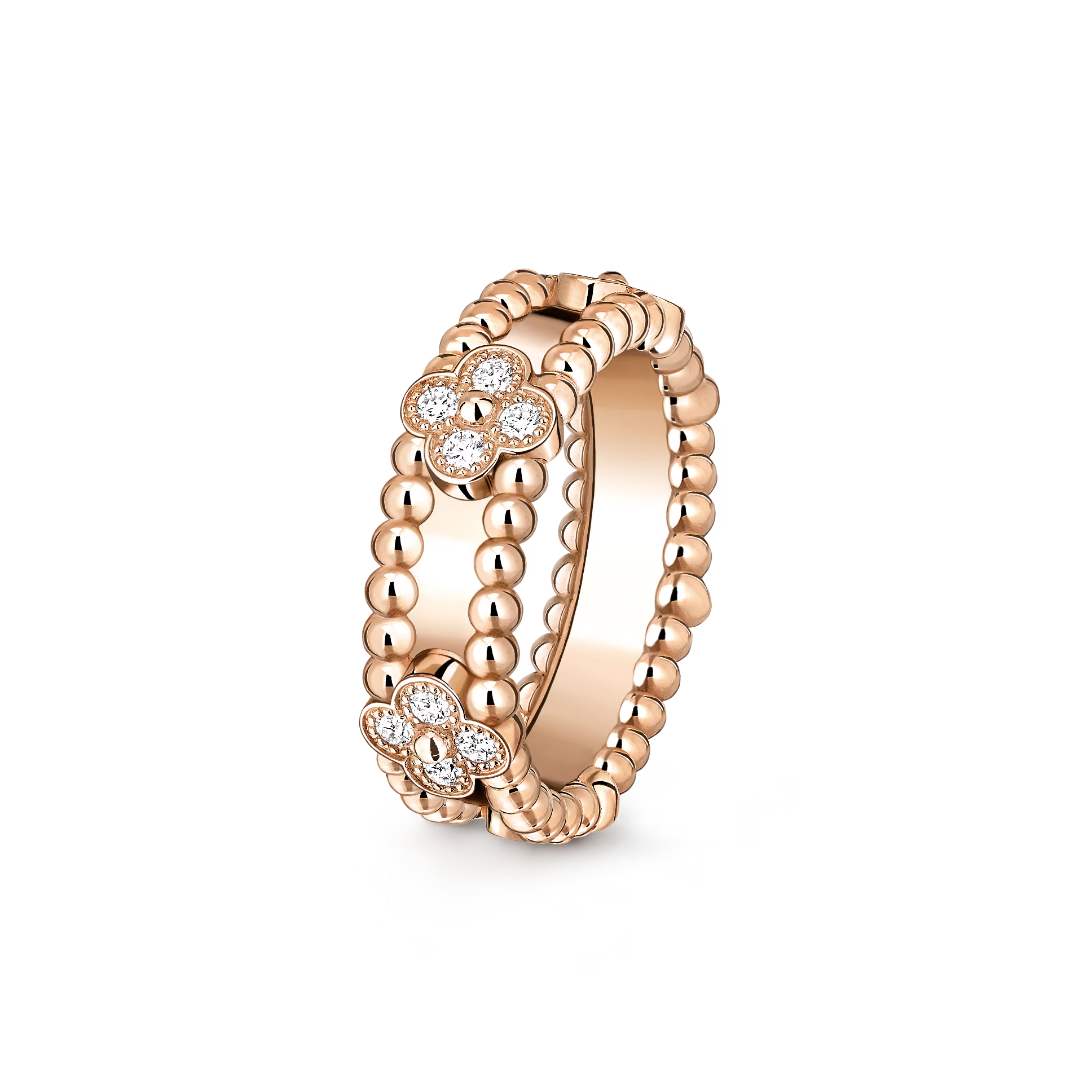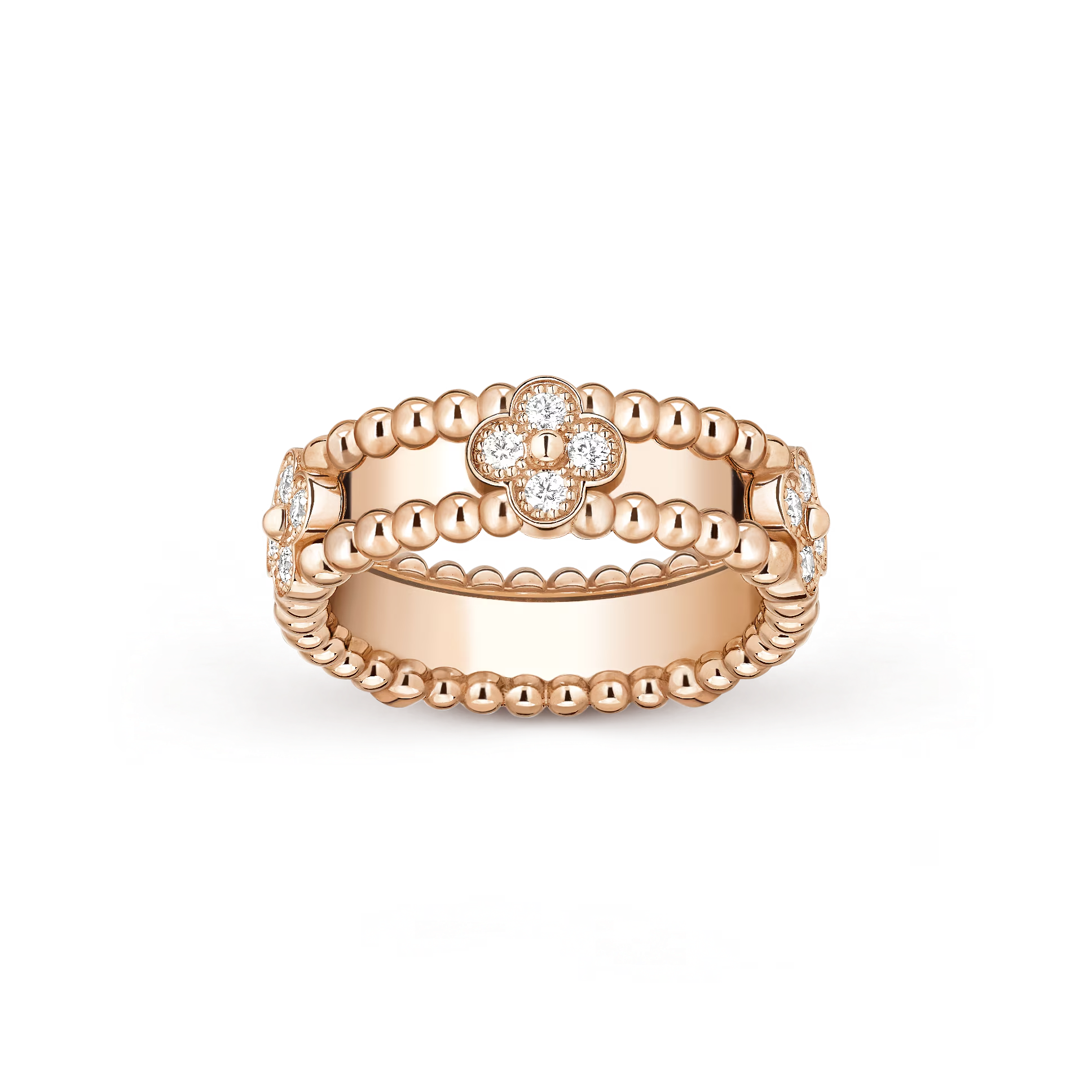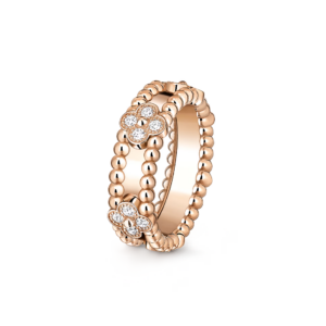Crafted in 18K rose gold, the ring features meticulously arranged Perlée beads that form the outline of a subtle yet radiant clover shape. Each petal is accented with brilliant diamonds, adding a touch of sparkle and sophistication. The refined proportions and smooth contours of the design make it perfect for both everyday wear and special occasions.