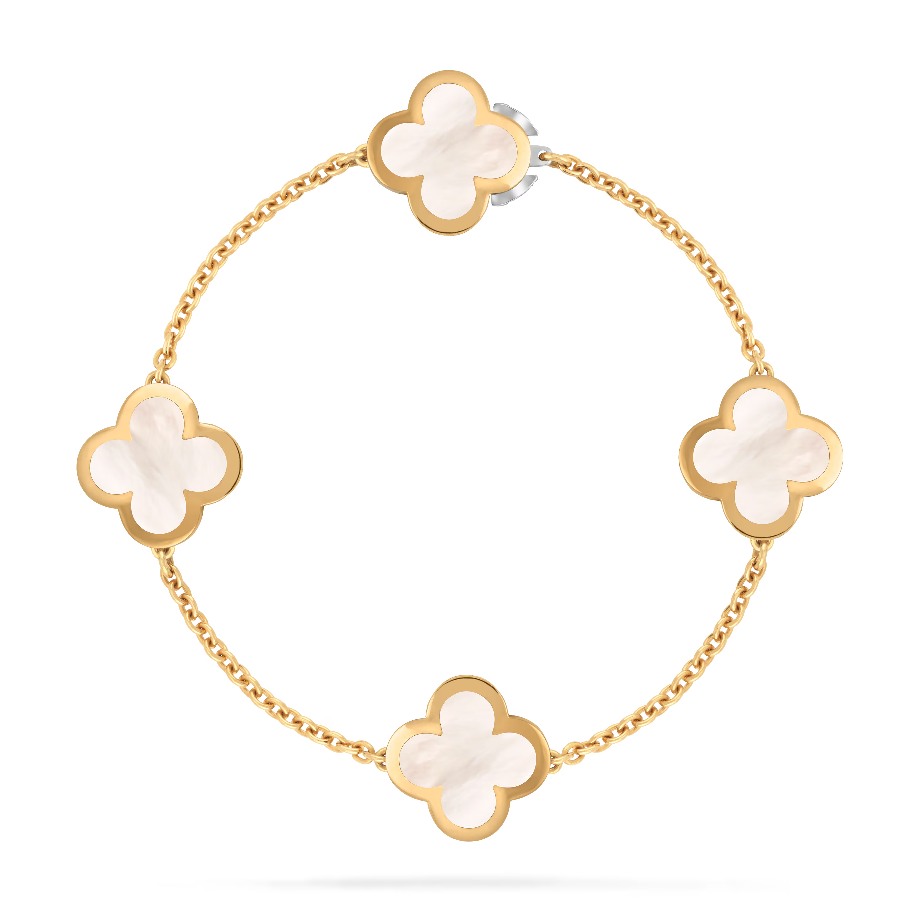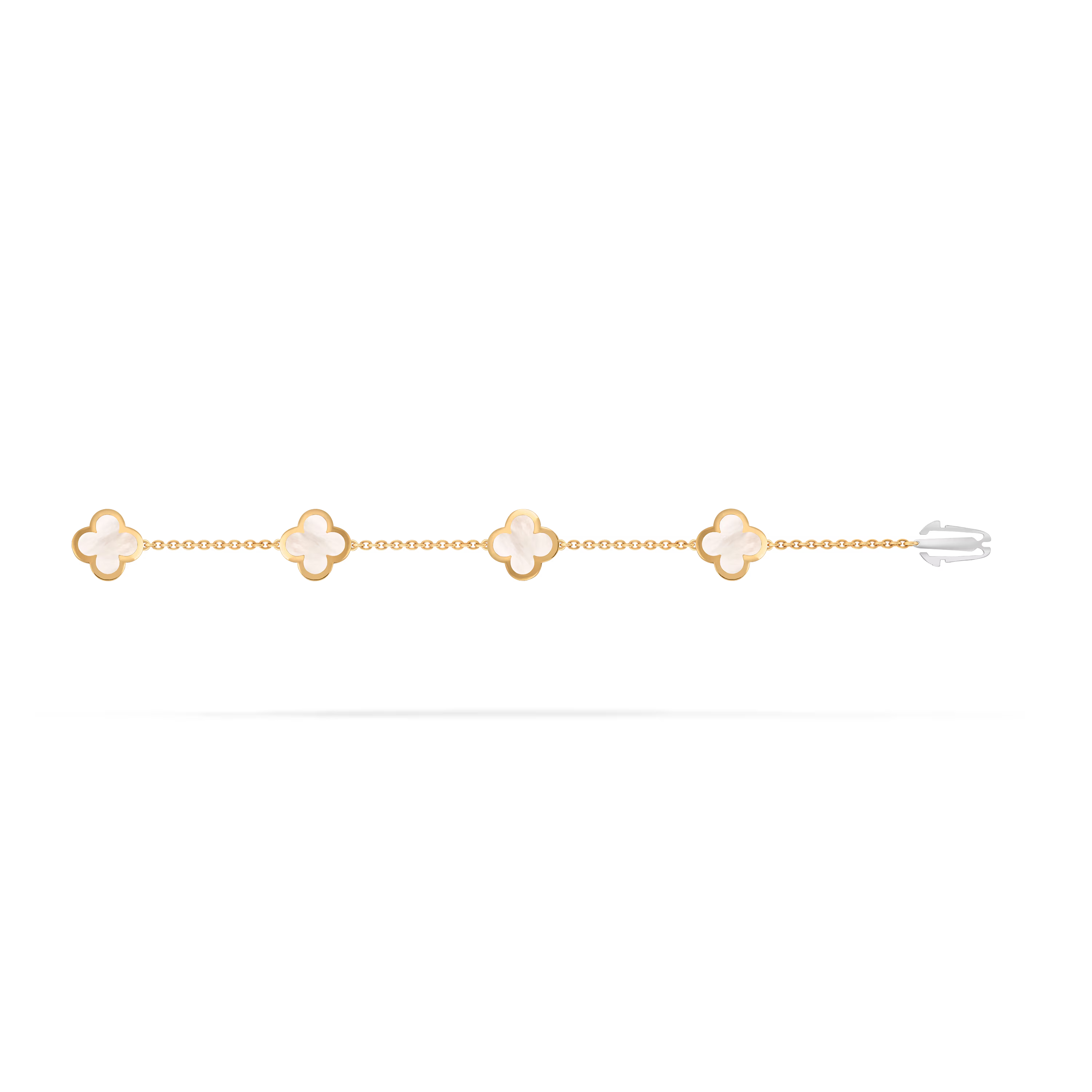 This bracelet features four Pure Alhambra motifs, evenly spaced along the wrist to create a sense of perfect symmetry. The uncluttered design emphasizes the purity of form, allowing the iconic shape to stand out with quiet confidence.