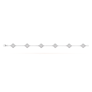This bracelet features six Sweet Alhambra motifs, gracefully arranged along a fine chain. The repeating clover design creates a refined rhythm on the wrist, offering a subtle yet expressive presence.