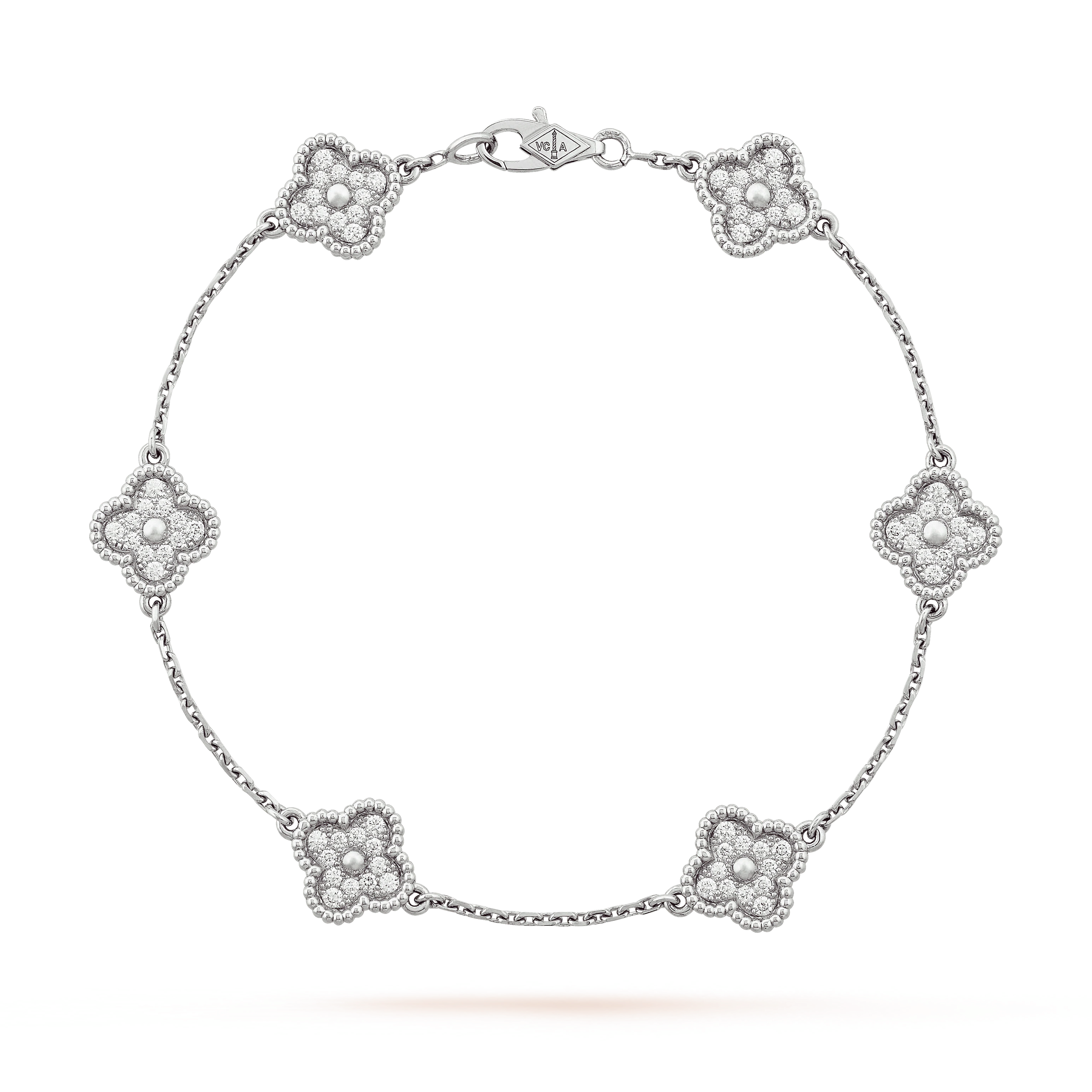 Each clover motif is outlined with the collection’s signature beaded edge, adding texture and depth while enhancing the recognizable aesthetic of the Sweet Alhambra collection.