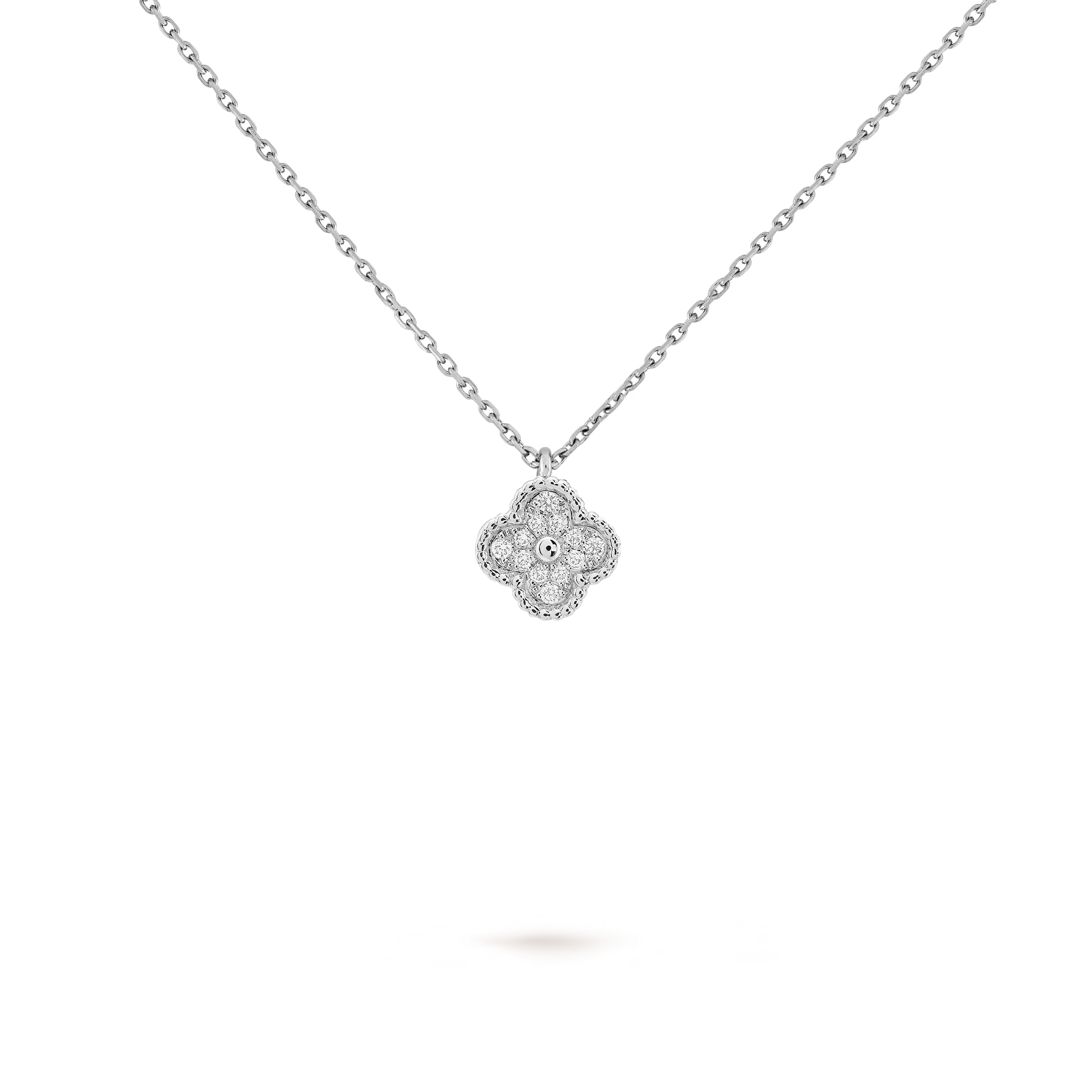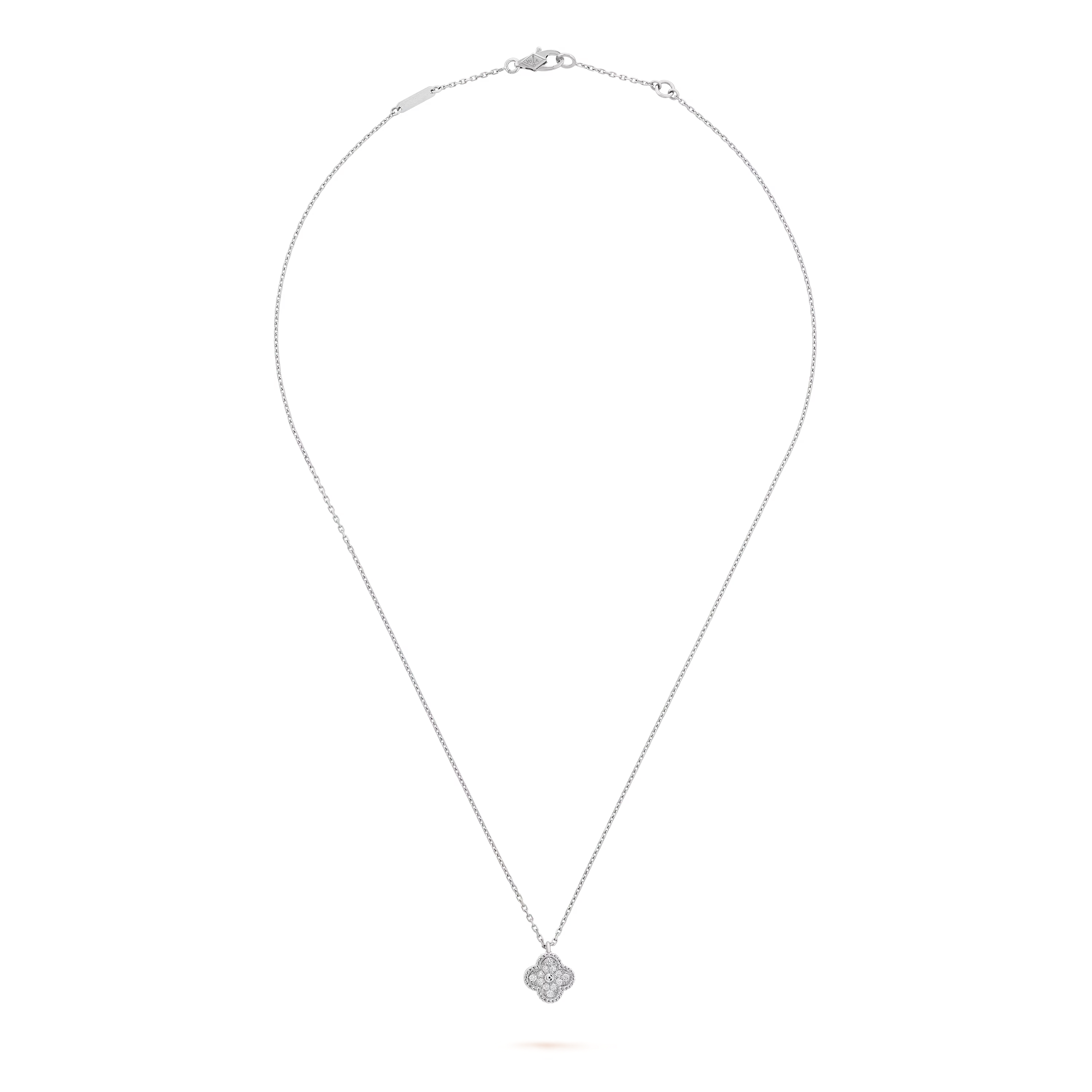This petite motif features soft curves and harmonious proportions, capturing the essence of the Alhambra aesthetic in its most delicate scale. Its subtle presence brings a touch of gentle radiance to the neckline.