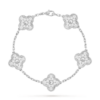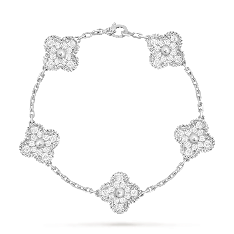 This bracelet features five Vintage Alhambra motifs, delicately aligned along the chain. The symmetrical arrangement creates a refined rhythm on the wrist, embodying balance and classic proportions.