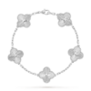 This bracelet features five Vintage Alhambra motifs, evenly spaced along the chain. The symmetrical arrangement creates a refined rhythm and balanced silhouette on the wrist, reflecting classic proportions and understated sophistication.
