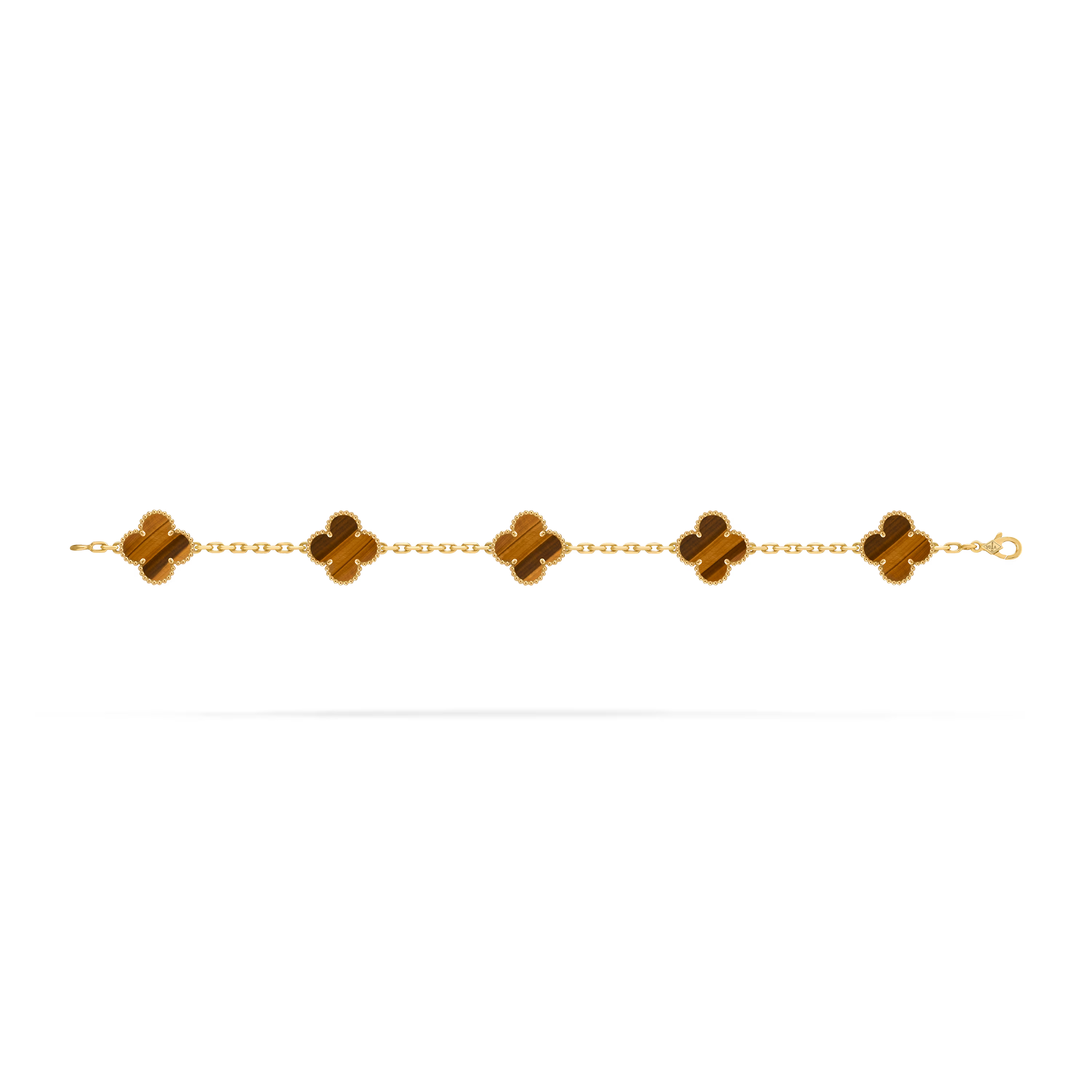 This bracelet features five Vintage Alhambra motifs, evenly spaced along the chain. The symmetrical composition creates a balanced and elegant rhythm on the wrist, highlighting the purity of the original design.