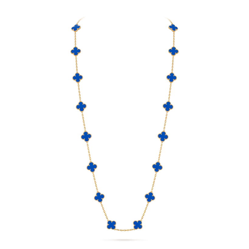 This Vintage Alhambra long necklace features twenty iconic four-leaf clover motifs crafted from natural materials and framed with delicate 18K gold beaded edges. The design embodies timeless elegance, harmony, and luck.
