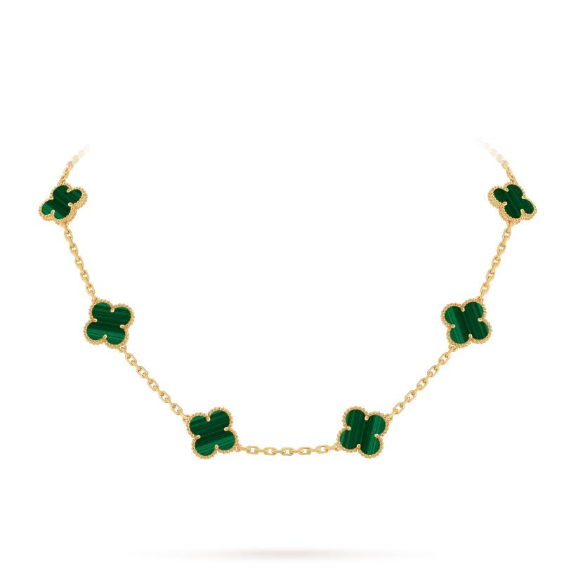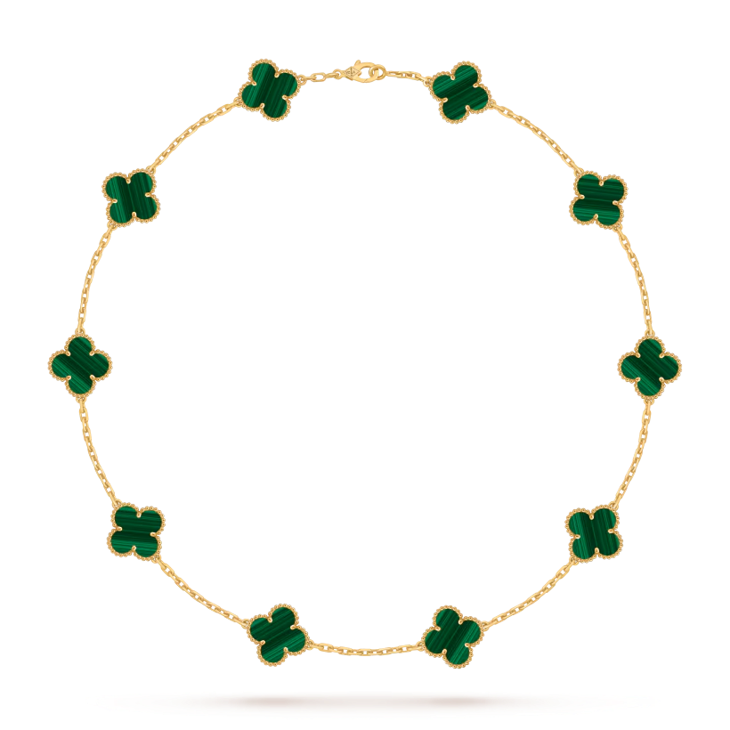 The Vintage Alhambra necklace features ten iconic four-leaf clover motifs, each crafted from natural materials and framed with delicate 18K gold beaded edges. This design symbolizes luck, harmony, and timeless elegance.