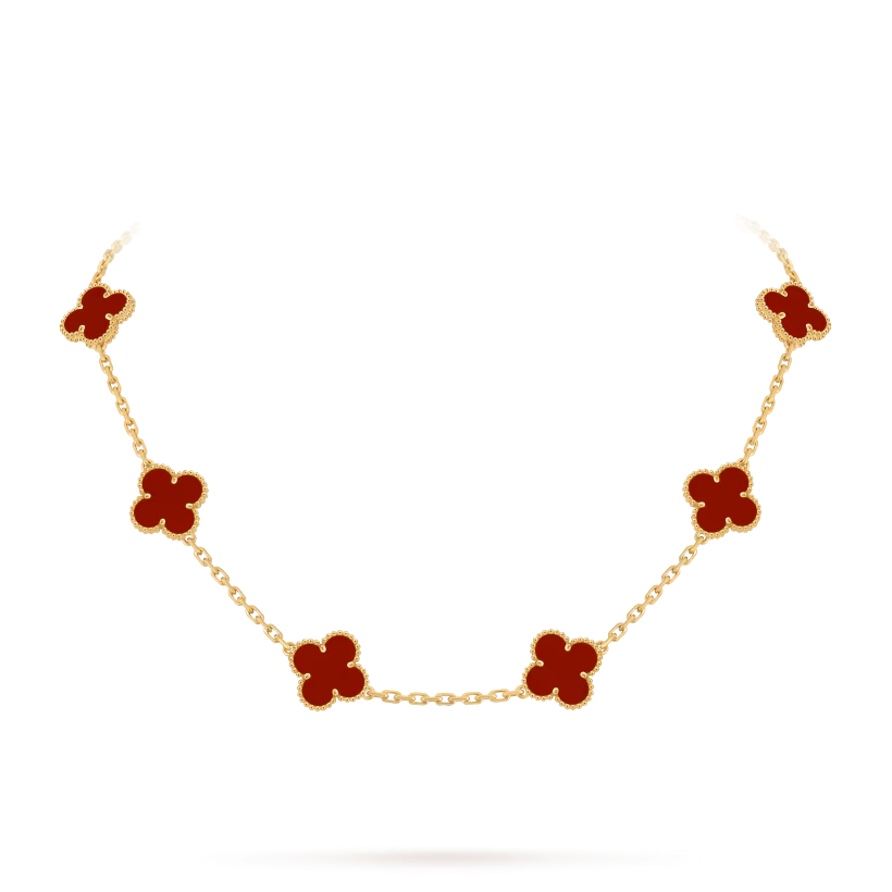 The Vintage Alhambra necklace features ten signature four-leaf clover motifs crafted from natural materials and framed with delicate 18K gold beaded edges. This piece symbolizes luck, elegance, and timeless craftsmanship.